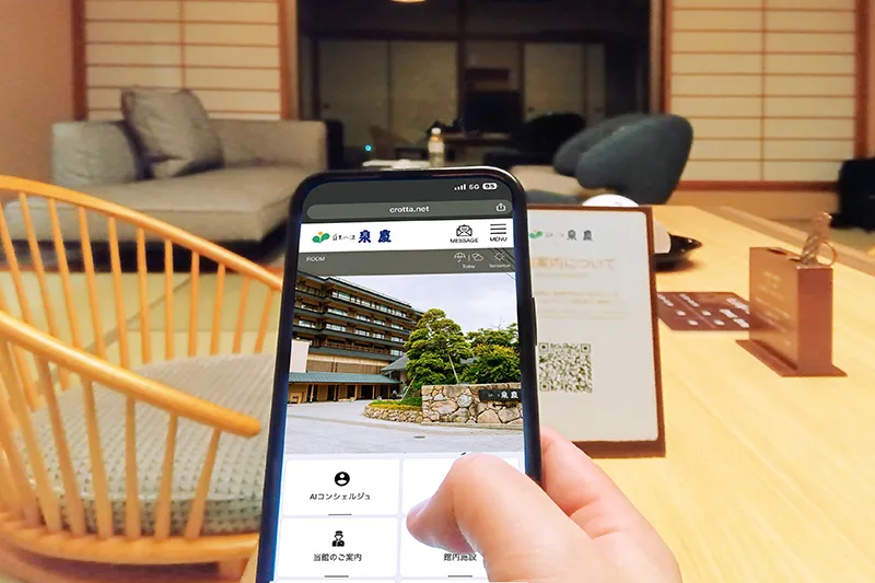 DXの導入は、従来人手に頼っていた業務の効率化を可能にし、スタッフの負担を大幅に軽減します。たとえば、当ホテルの3施設に導入した多言語客室インフォメーション「クロッタ」は、お客様のスマートフォンでQRコードを読み取るだけで、貸切露天風呂の予約やルームサービス、お土産物の注文が簡単に行える仕組みです。これにより、問い合わせ対応の迅速化が実現し、スタッフの業務負担が軽減されるだけでなく、顧客満足度の向上にもつながっています。デジタルは多言語対応も容易なので、外国人ゲストの対応を考えても非常に有益ですね。